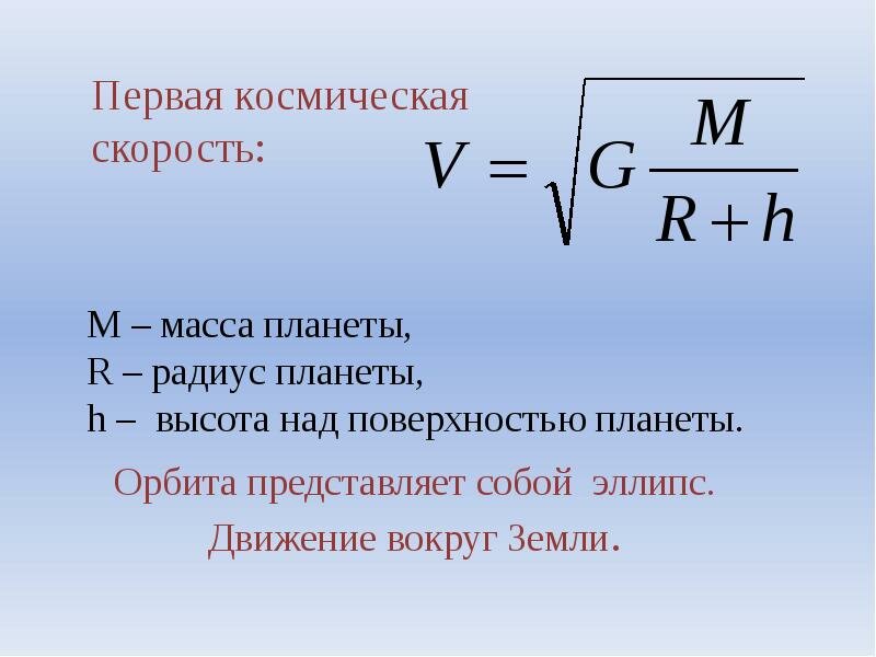 Первой космической скоростью называется скорость, которую надо сообщить телу, чтобы оно стало спутником Земли и двигалось по круговой орбите на небольшой по сравнению с радиусом Земли высоте.